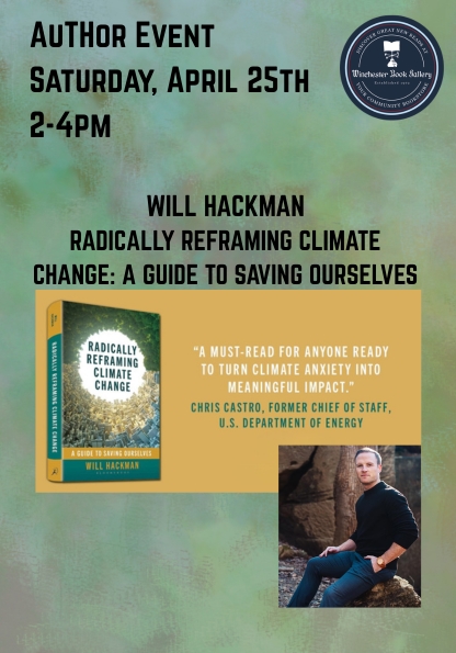 Author Will Hackman identifies three main obstacles to solving climate change: polarization, paralysis, and stale, ineffective messaging. He empowers readers to turn their anxiety or apathy into passion, and anger into action at the personal, community, and government levels. Come celebrate Apple Blossom, Independent Bookstore Day, and Will Hackman’s new release! He will be here to sign books, answer questions about his book, and chat about anything climate related.