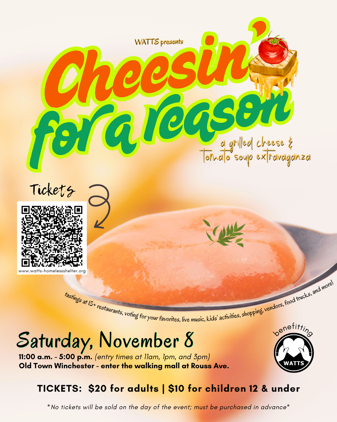 Winchester Walking Mall Loudoun Street, Winchester, V, United StatesOur 1st Annual Grilled Cheese and Tomato Soup Extravaganza for Winchester! 🧀🍅 WATTS will be "Cheesin' for a Reason" this fall and we hope you'll come out and join us in honor of one of our guests' favorite meals. Your ticket includes tastings/samplings of this classic, comfort food combo (with some flair!) from 15+ restaurants […]